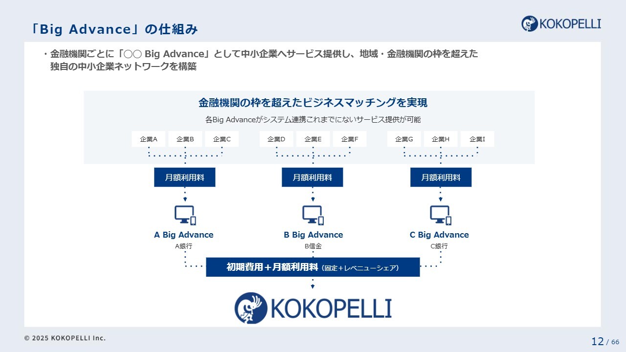 「Big Advance」は、サービスを直接中小企業に提供するのではなく、いったん地域の金融機関に提供し、金融機関のサービスとして取引先の企業に提供している点が大きな特徴です。現在、約80行の金融機関と約6万社の企業にご利用いただいています。