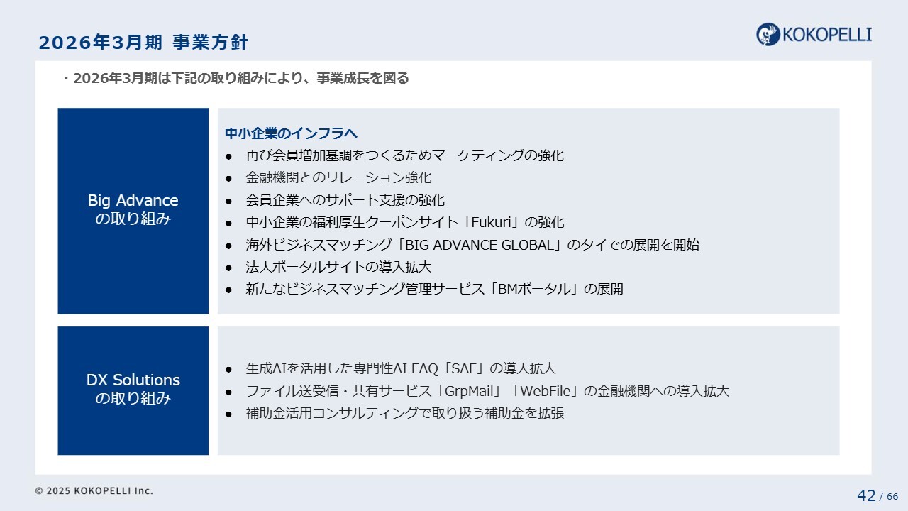 また、当社の強みである金融機関とのネットワークを活用したリレーションの強化、会員企業へのサポート支援の強化、クーポンサイト「Fukuri」の強化、「BIG ADVANCE GLOBAL」のタイでの展開開始、法人ポータルサイト導入の拡大、そして「BMポータル」の拡大を事業方針として、着実に実現したいと考えています。
