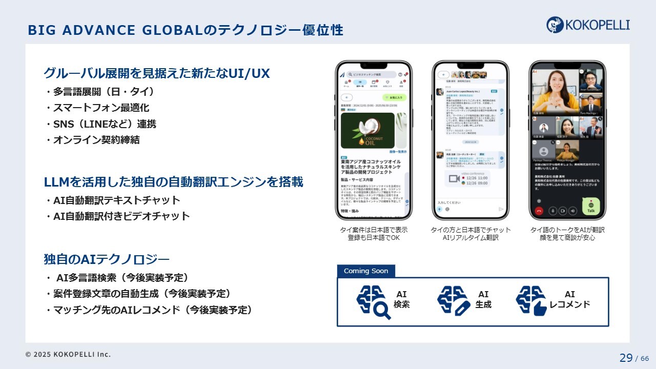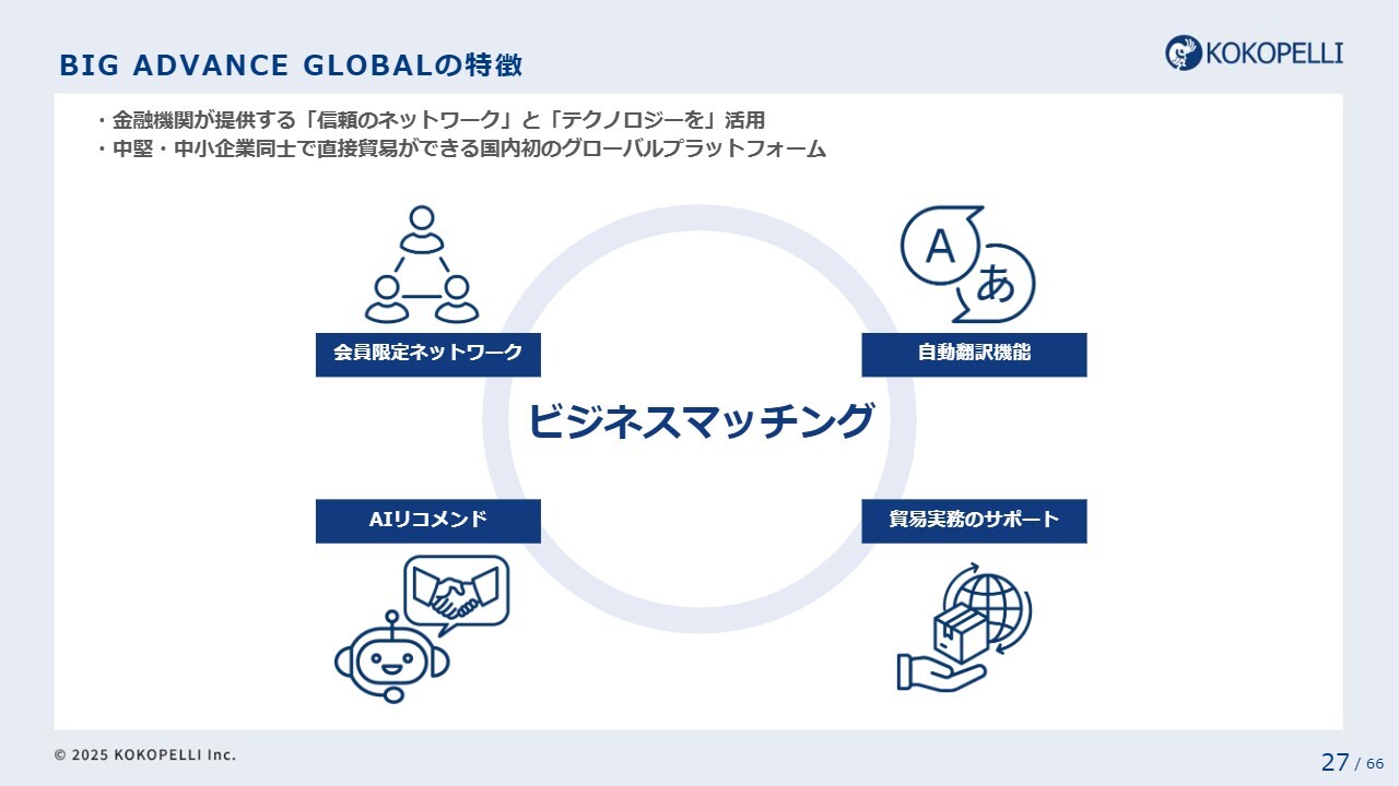 「BIG ADVANCE GLOBAL」の特徴は主に4つあります。1つ目は、国内で非常に多くのユーザーから支持されており、金融機関のネットワーク内で利用されている点です。この実績を基に、海外展開も同じコンセプトで進めており、現在タイの金融機関とも協議を進めています。金融機関を介した信頼性の高いネットワークを構築していくことが大きな特徴です。