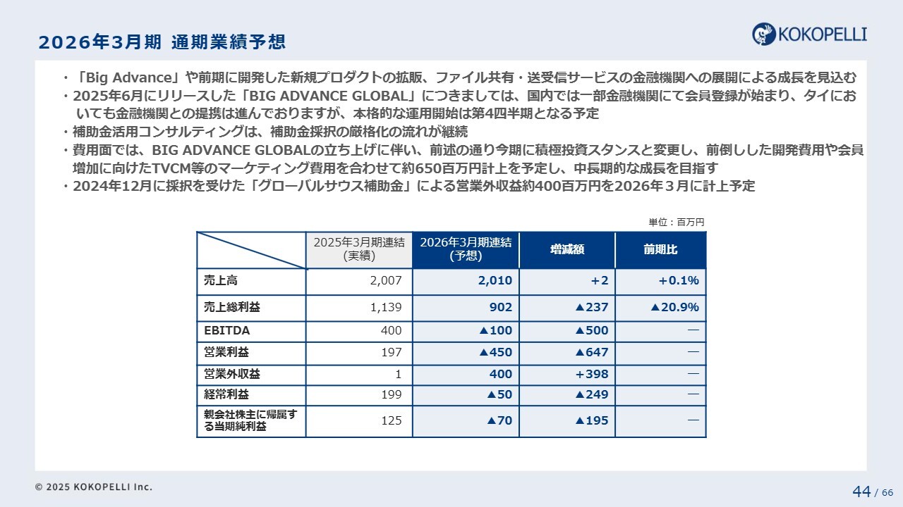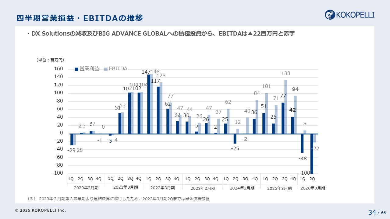 また、現在積極的に投資を行っている「BIG ADVANCE GLOBAL」の影響により、EBITDAおよび営業利益がともに赤字となりました。ただし、グローバルサウス補助金を活用する予定であり、今期の末には営業外収益として補助金収入が計上される見込みです。