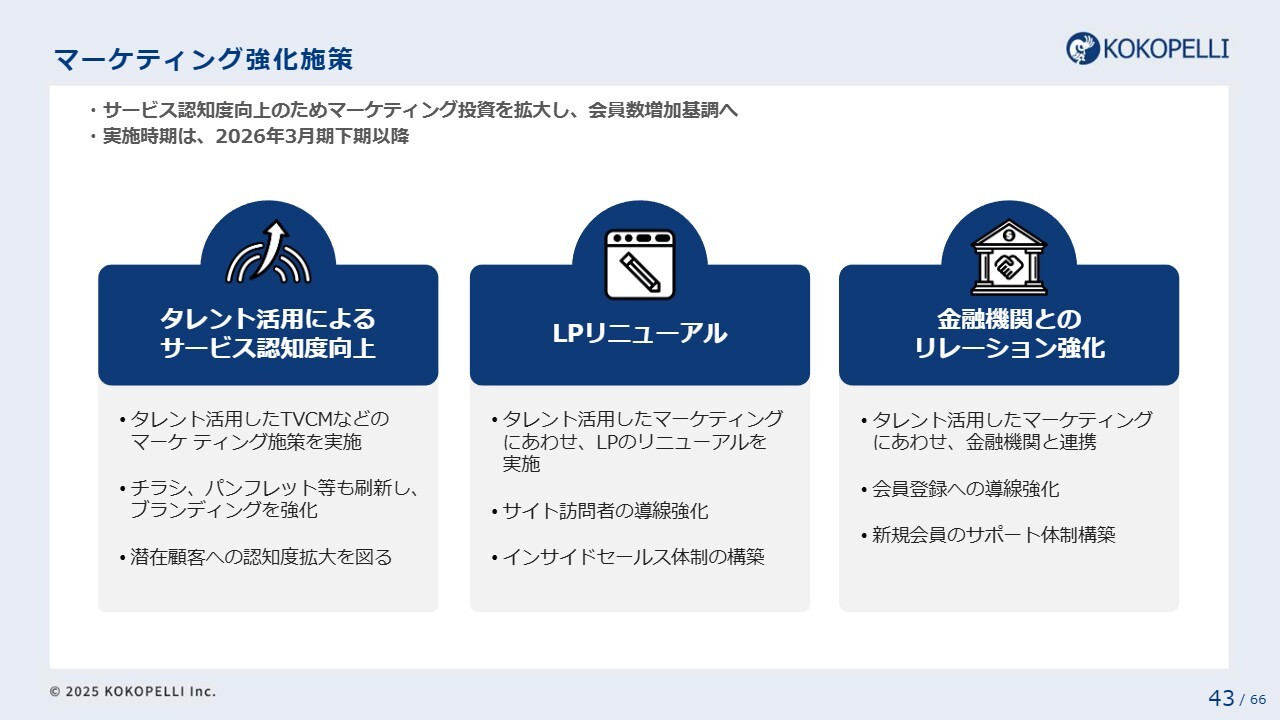 マーケティング強化施策についてですが、当社では初めてタレントを起用して告知を開始しました。CMだけでなく、新しいLPの作成や、金融機関に配布しているチラシやパンフレットのリニューアルも進めています。これらの取り組みにより、サービスの認知度を向上させ、会員さまの増加基調を作り上げていきたいと考えています。
