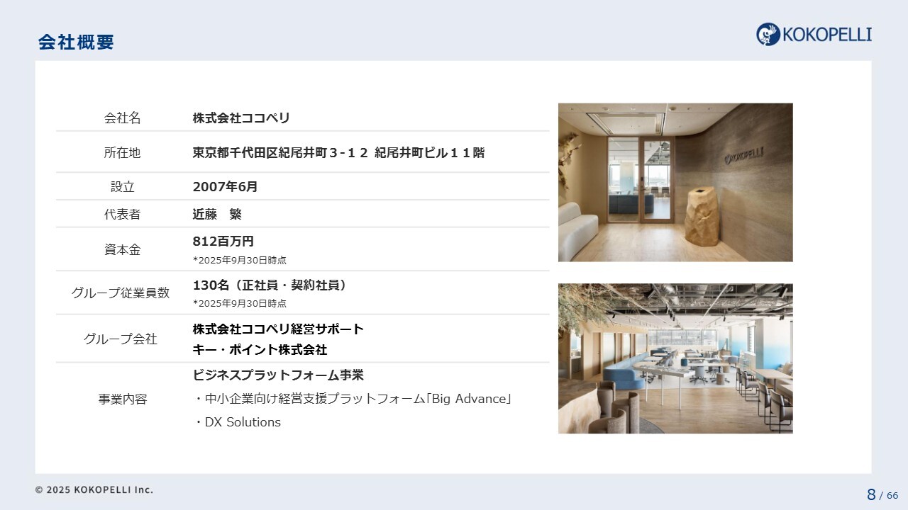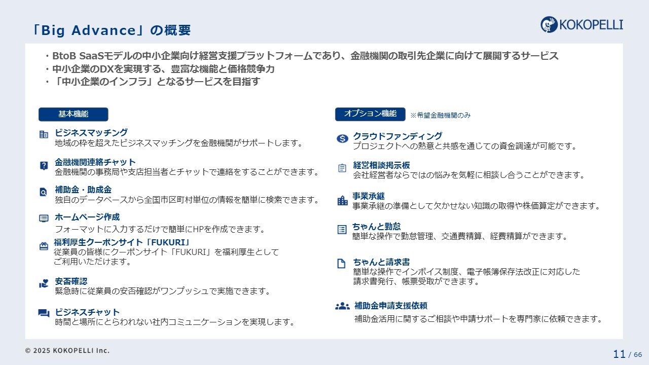 事業内容としては、中小企業向け経営支援プラットフォーム「Big Advance」を中心とするビジネスプラットフォーム事業を展開しています。