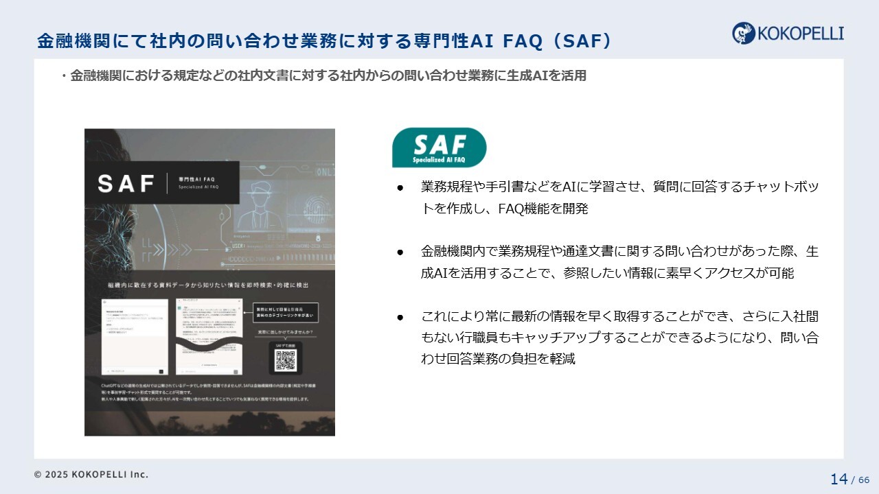 今年開始したもう1つのサービスは「SAF」です。これは生成AIを活用したチャットボットで、金融機関の業務規定や通達を個別に学習させることで、金融機関の職員がそのチャットボットに質問すると、的確に答えることができるサービスです。