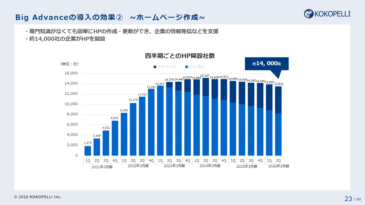 ホームページの作成については、約1万4,000社の企業が「Big Advance」を活用しており、中小企業の地域におけるDXの第一歩として非常に好評をいただいている機能です。