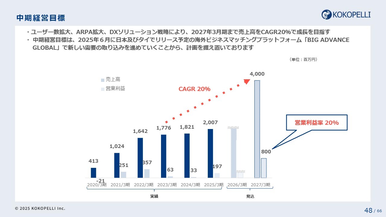 売上高としては40億円、営業利益率20パーセントの8億円を目指しています。足元では非連続的な成長が求められるため難しい数字ではありますが、先ほどの「BIG ADVANCE GLOBAL」の運用やM&Aも視野に入れながら、しっかりとこの数字を実現していきたいと考えています。