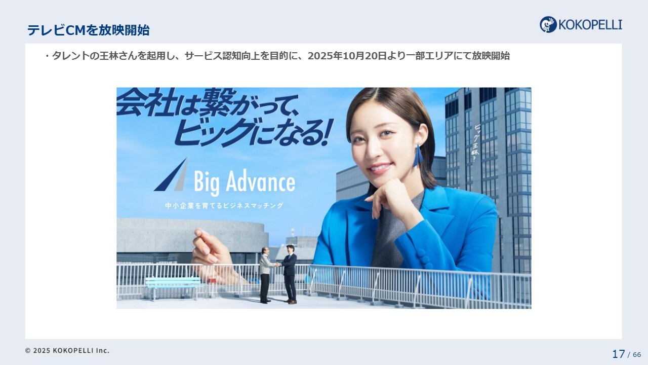 第2四半期の主要トピックスです。当社では初めてタレントの王林さんを起用し、サービスの認知向上を目的として10月20日よりテレビCMを一部エリアで放映開始しました。その後も、王林さんを起用したLPの制作やチラシ作成など、「Big Advance」のブランディングおよび認知度向上を図る取り組みを進めています。