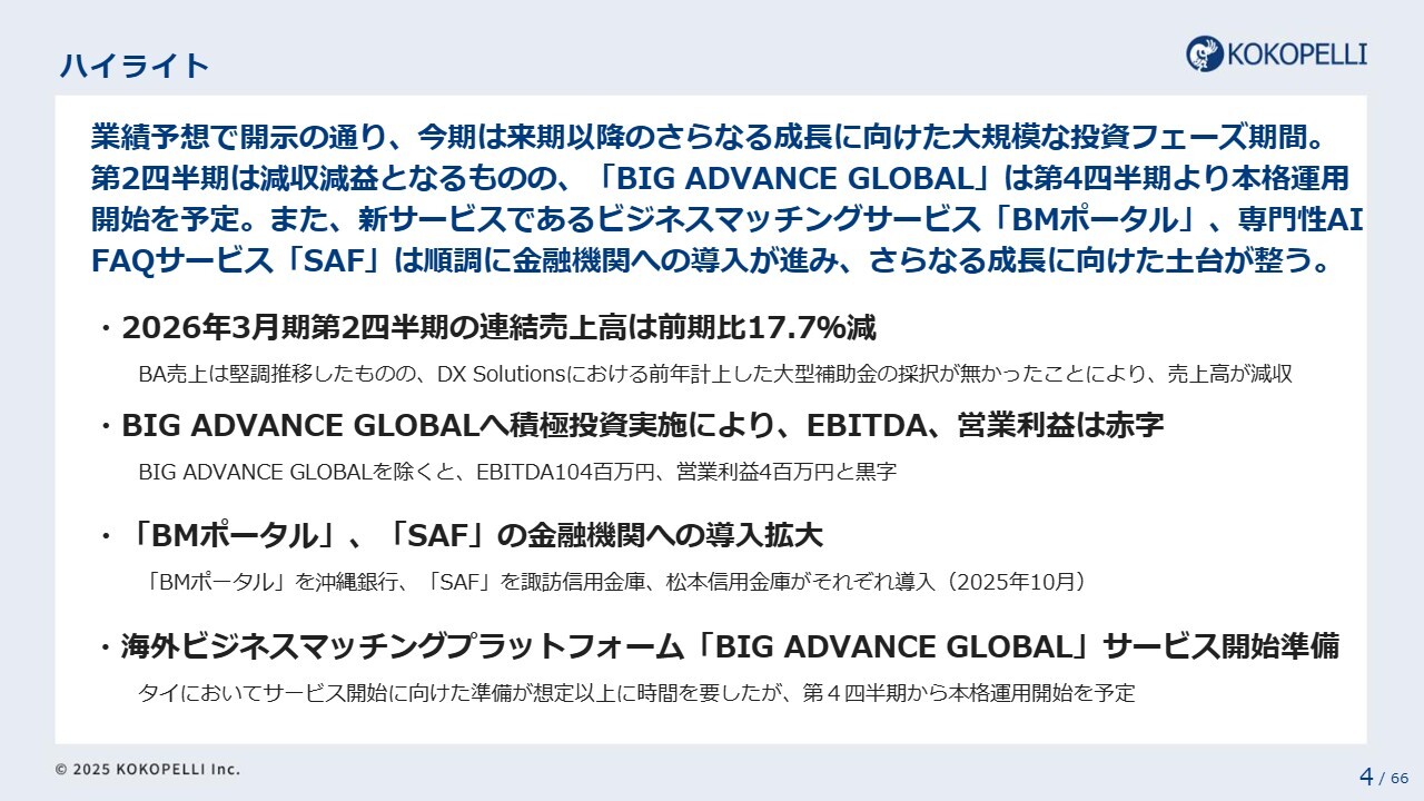 そのほか、「BIG ADVANCE GLOBAL」を除いた部分におけるEBITDAは1億400万円の黒字、営業利益も400万円の黒字となりました。また、先ほど申し上げた新サービスの「BMポータル」「SAF」は、金融機関への導入が拡大しています。