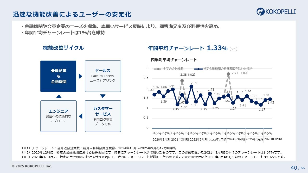 チャーンレートについてですが、第2四半期は若干上昇しましたが、1パーセント台で推移しています。UI/UXを含めた改善を進めながら、さらに低下させていきたいと考えています。