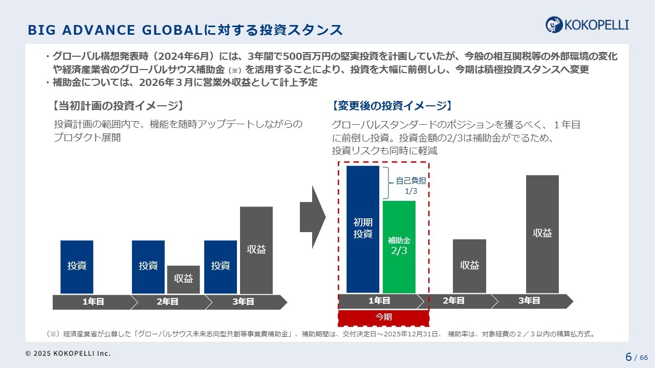 「BIG ADVANCE GLOBAL」に対する投資スタンスについて、あらためてご説明します。もともとこのグローバル構想を2024年6月に発表した際には、3年間で約5億円の投資を計画していました。