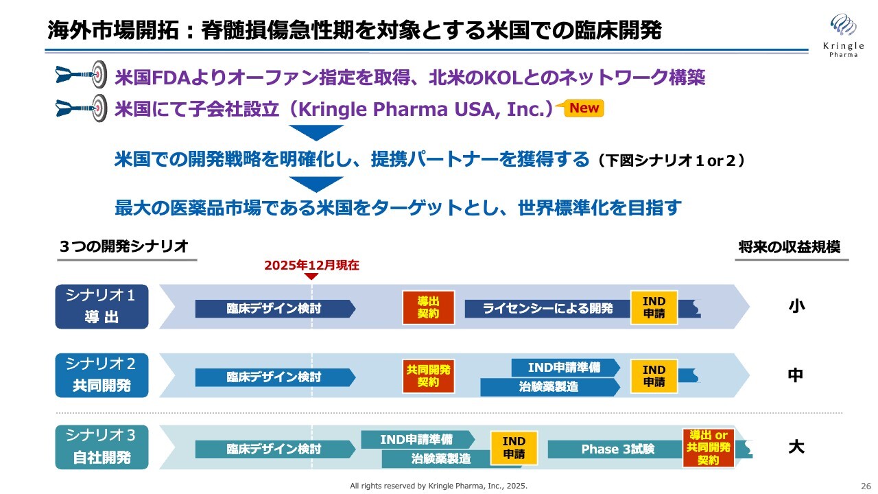 このような背景を踏まえ、私たちはシナリオ2の共同開発に取り組んでいます。脊髄損傷急性期は非常に開発の難易度が高い分野ですが、私たちは国内でこれまでに2本の臨床試験を実施し、その過程でさまざまな知見を得ています。米国でも企業オピニオンリーダーの先生方とすでにディスカッションを行い、米国での治験デザインを固めつつあります。