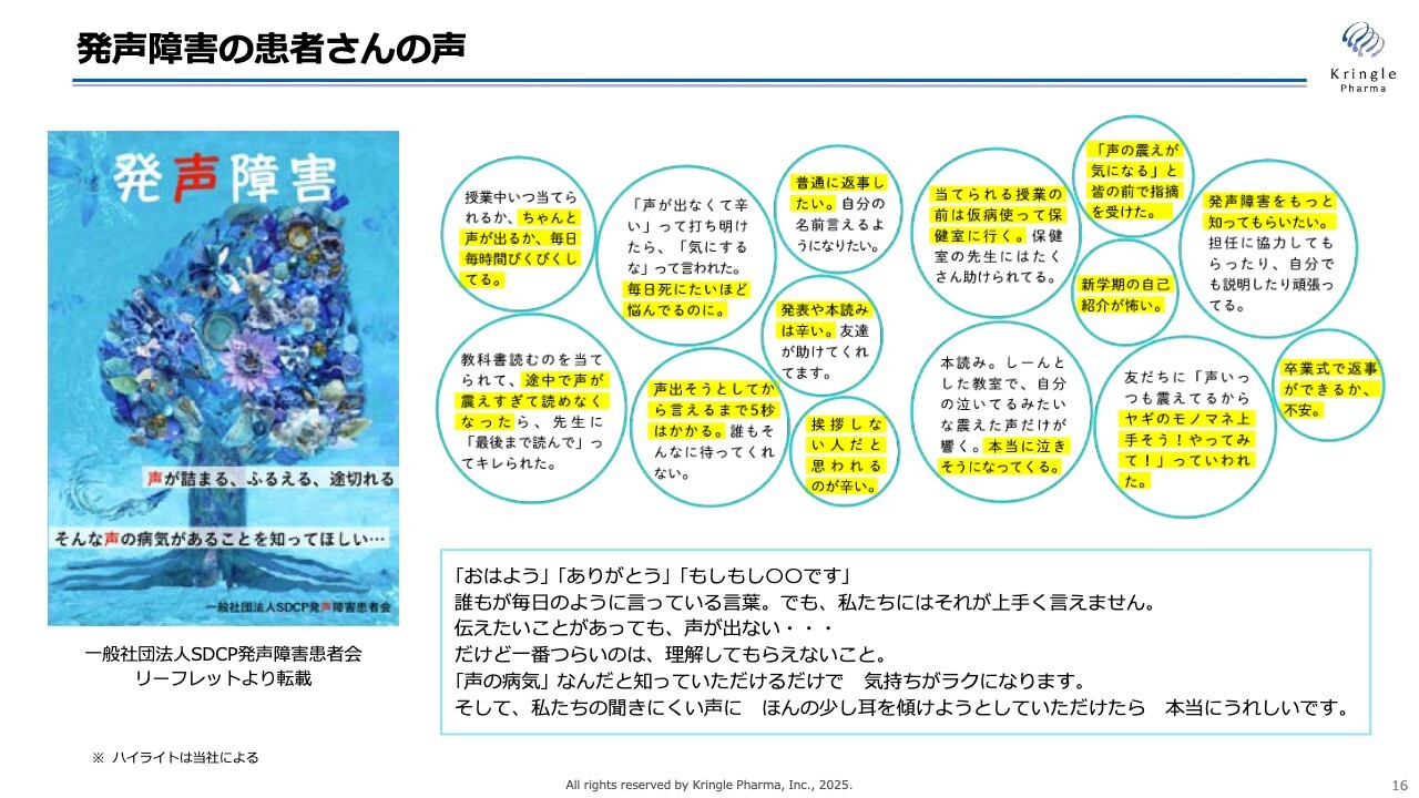 しかしながら、私たちは決して諦めたわけではありません。追加の試験を実施し、必ず承認を取得する、また声帯瘢痕についても承認を取得するという決意のもと、さらにグローバル開発にも力を注いでいきます。どうか長い目で、私たちを引き続きご支援いただけると幸いです。