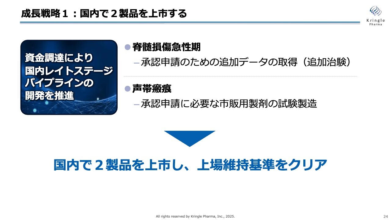 まず、成長戦略の一の矢として、レイトステージのパイプラインである脊髄損傷急性期および声帯瘢痕の2剤について、国内で承認申請し上市する計画です。当社が製造販売承認を取得し、製品を保有することとなります。