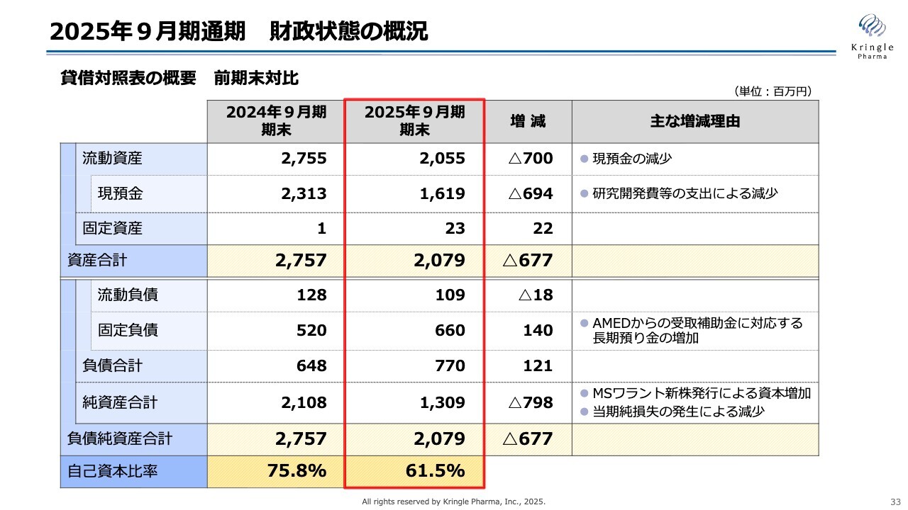 純資産合計は13億900万円、負債純資産合計は20億7,900万円です。自己資本比率は前期末と比較して61.5パーセントに減少していますが、現在資金調達が進行中であり、それに伴って調達が増加すれば、こちらの数値も上昇すると考えています。