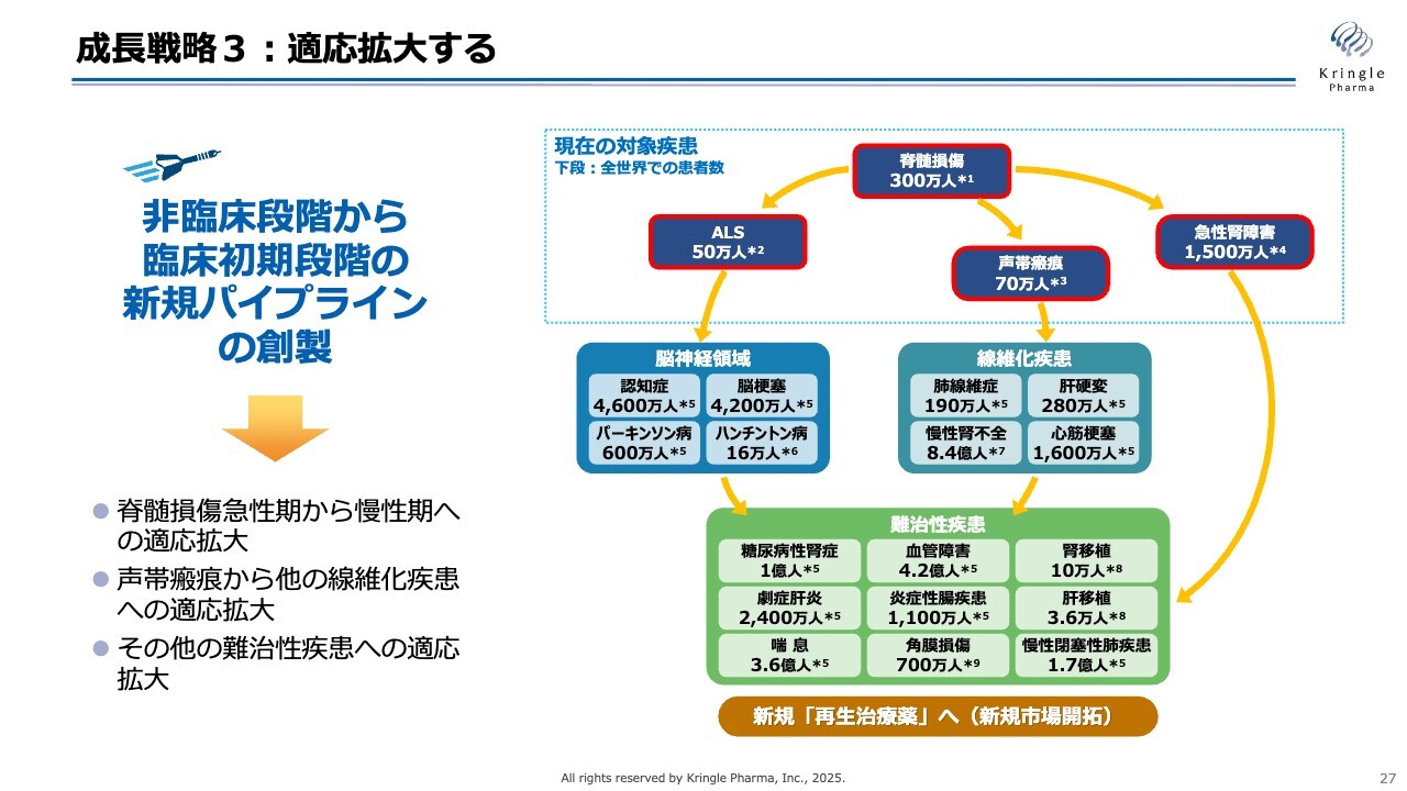 成長戦略の三の矢は適応拡大です。スライド右側には、これまでHGFが動物モデルで効果を示した症例と、グローバルでの患者数が示されています。現在、私たちが開発しているのはスライド上部の四角で囲まれた部分ですが、HGFの可能性は非常に幅広いため、今後は適応拡大を巧みに進め、HGFの価値を最大化することが重要です。