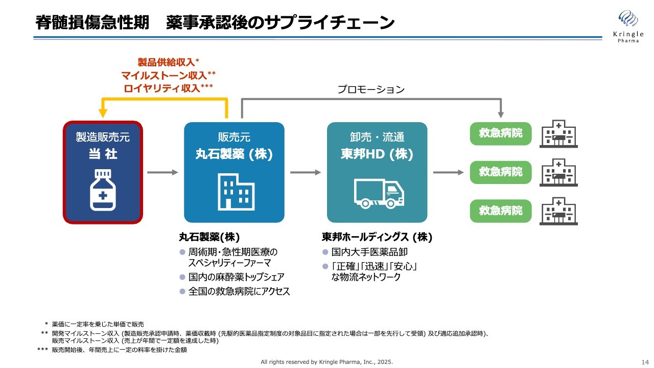 当社は、追加の試験を実施して製造販売承認を取得する方針に変更はありません。また、承認後のサプライチェーンについても、スライドに記載されているとおり、丸石製薬さまが販売元となり、東邦ホールディングスさまが卸売・流通を担うという体制も変更ありません。さらに、丸石製薬さまおよび東邦ホールディングスさまとの契約も維持されます。