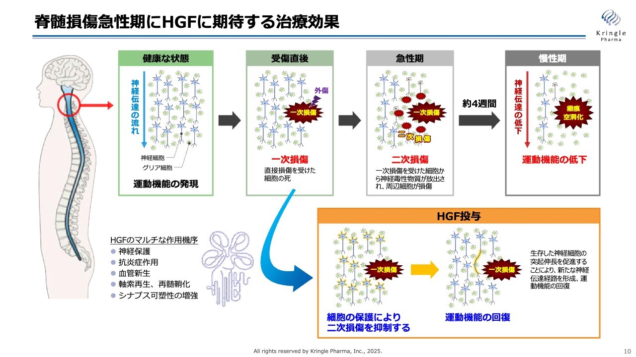 こちらは振り返りとなりますが、脊髄損傷の急性期におけるHGFに期待される治療効果をまとめたものです。脊髄損傷は、さまざまな原因によって一次損傷が生じた後、受傷後の約2週間から1ヶ月程度の間に二次損傷が進行し、損傷範囲が拡大するというイベントが起こります。