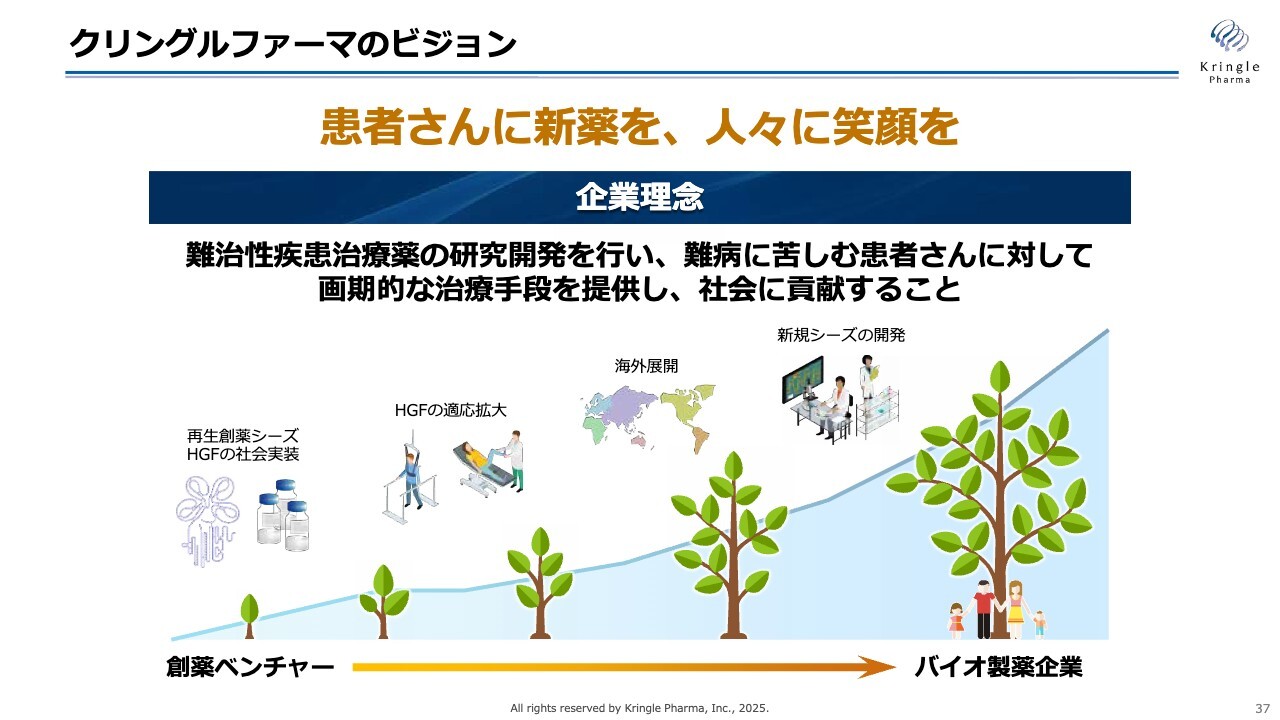 今般、米国で子会社のKringle Pharma USAを設立し、今期はさらに米国での活動を加速させたいと考えています。米国での開発戦略が明確になるにつれ、現在進行中の提携パートナーとの交渉も進展する見込みです。なんとか提携パートナーを確保し、開発を実際に進めたいと考えています。