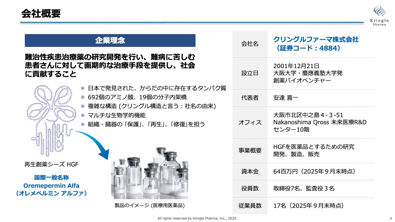 当社は「難治性疾患治療薬の研究開発を行い、難病に苦しむ患者さんに対して画期的な治療手段を提供し、社会に貢献すること」を企業理念とする大学発の創薬バイオベンチャーです。