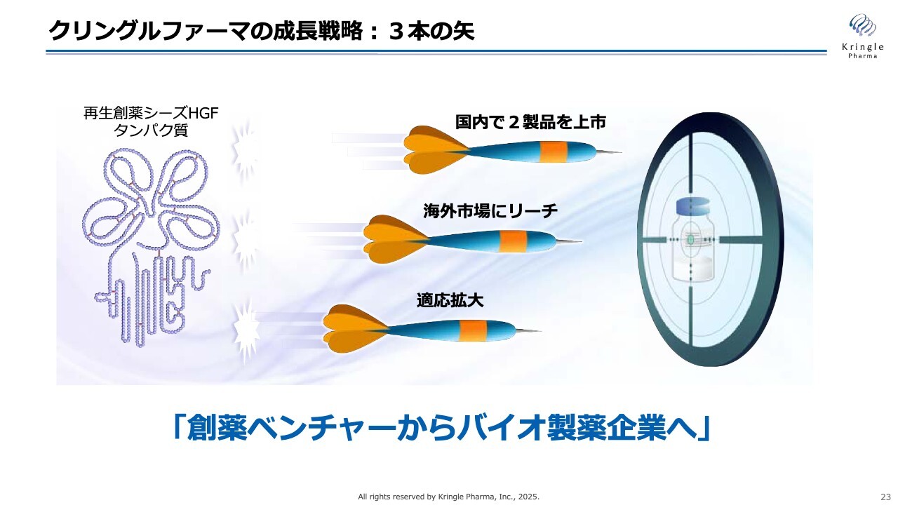まず、第1の矢は国内で2製品を上市すること、第2の矢は海外市場にリーチすること、そして第3の矢は適応拡大を図ることです。これにより、再生創薬シーズHGFの社会実装を目指します。