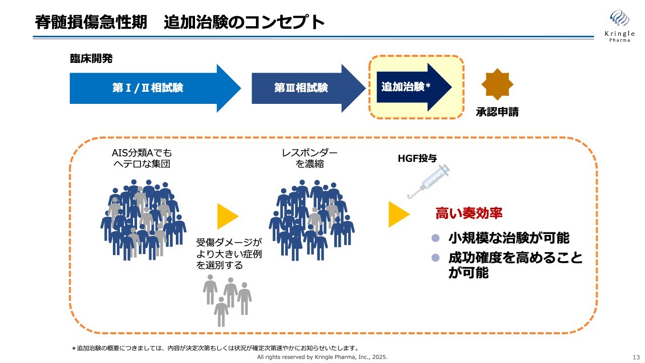 そのため、次の追加試験では、受傷ダメージが大きい症例をなんらかの基準で除外し、レスポンダーを濃縮することでHGF投与による高い奏効率を得ることを目指します。このアプローチにより、小規模な治験が可能となり、成功確度も高まると考えています。基本的には、前相第Ⅲ相試験と同じく、単群非盲検試験を実施し、データベースと比較することで薬剤の効果を検証する方針です。