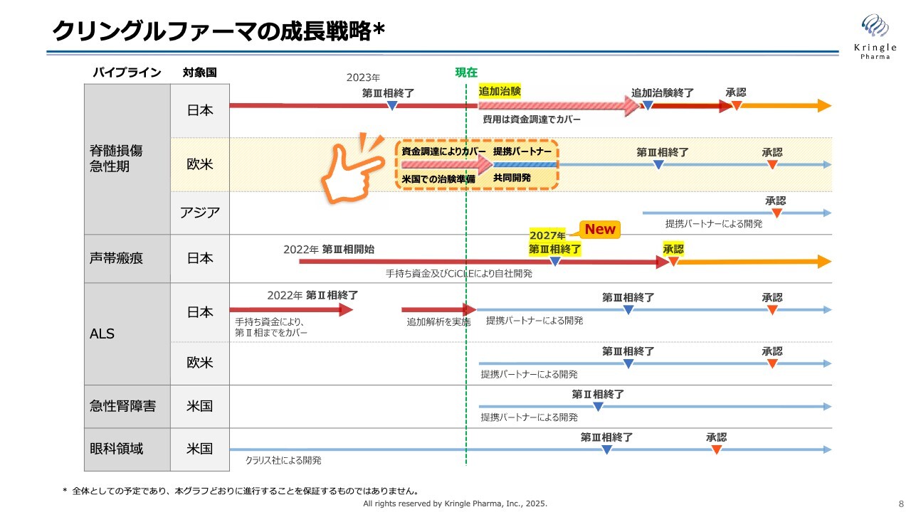 こちらも、毎回示している成長戦略です。脊髄損傷の国内については、追加治験の矢印を新たに加えました。また、声帯瘢痕に関する新たな情報として、患者さまの組入れ終了の目処が立ってきました。その後、1年間の経過観察を行うため、第Ⅲ相試験の終了タイミングとして2027年を新たに加えています。