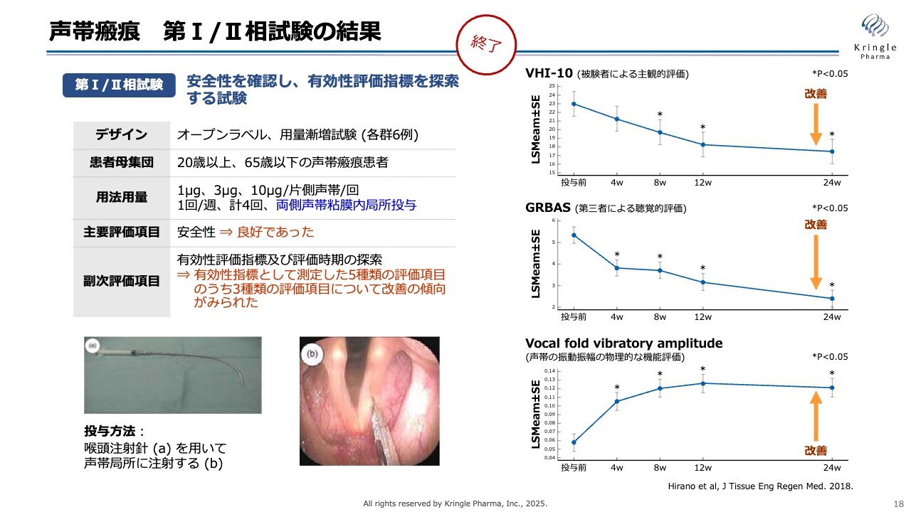 当社はすでに国内で第Ⅰ/Ⅱ相試験を終了しています。この試験はオープンラベルで実施し、患者さまを対象に行いました。声帯瘢痕については既存薬がないため、臨床試験の前例も世界的にほとんどありません。