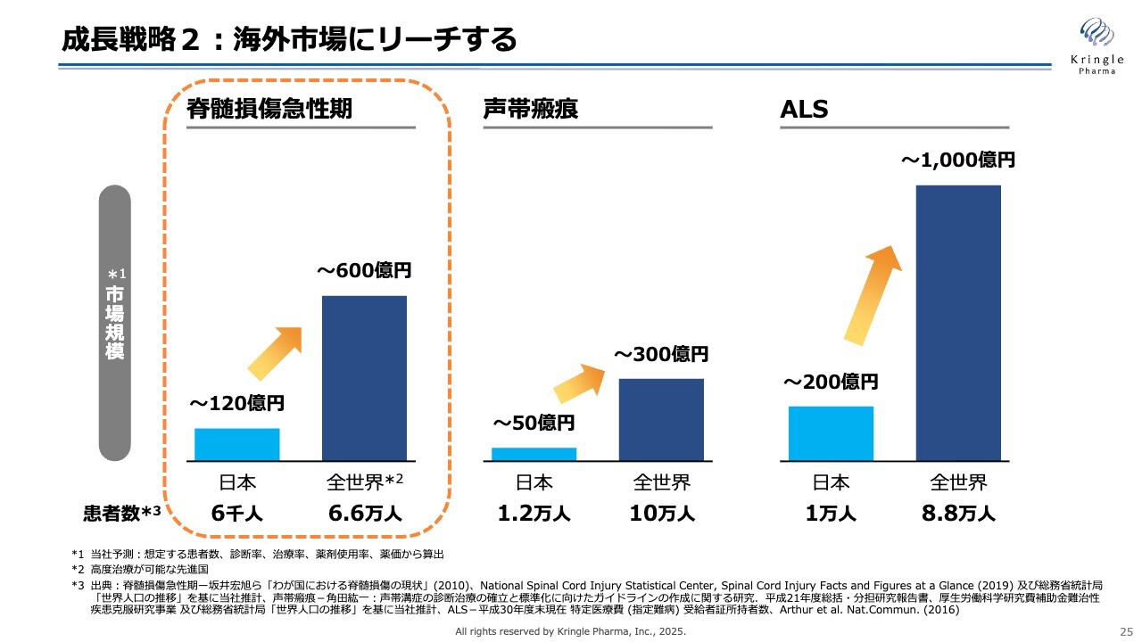 成長戦略の二の矢にあたるのが海外市場へのリーチです。脊髄損傷急性期、声帯瘢痕、ALSはいずれも希少疾患であり、日本国内だけで考えると市場はどうしても限定的です。