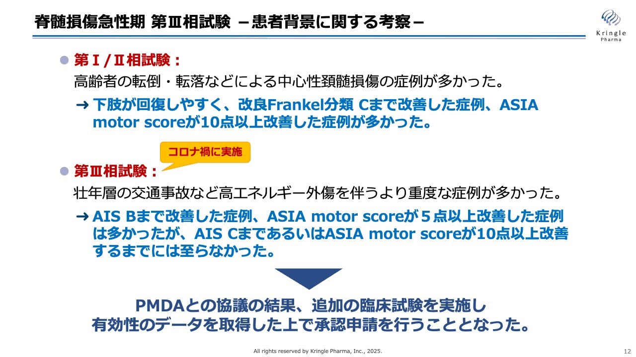 まず、国内におけるレイトステージの開発パイプラインについてです。脊髄損傷急性期に関しては、国内で第Ⅲ相試験を終了し、PMDAと約1年間協議を継続してきました。当社としては承認申請に進む意向でしたが、PMDAから追加試験の実施が求められました。そのため、追加試験を実施した上で承認申請を行う方針を今年7月に決定しました。