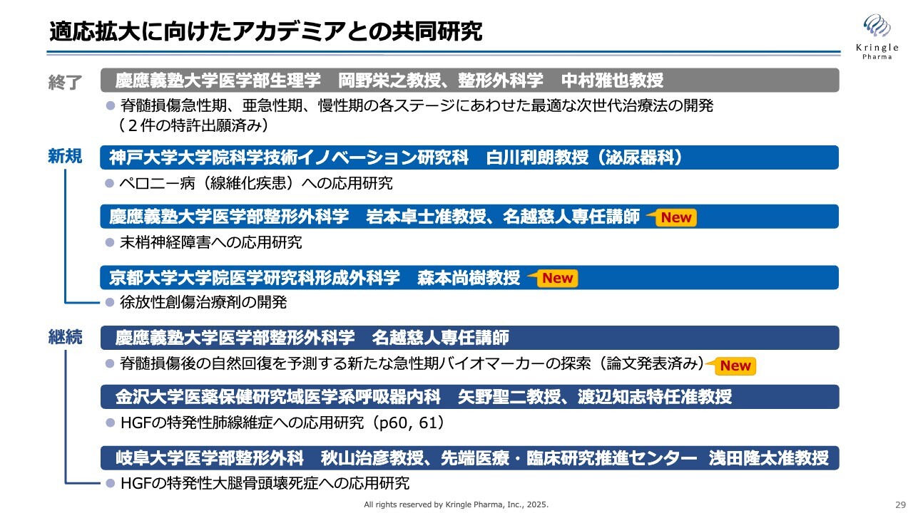 最後に適応拡大の話題です。3件の共同研究を新たに開始しました。1件目は、神戸大学との共同研究で線維化疾患の一種であるペロニー病への応用研究に関するものです。2件目は、慶應義塾大学との共同研究で末梢神経障害への応用研究です。3件目は、京都大学との共同研究で徐放性創傷治療剤の開発に関するものとなっています。