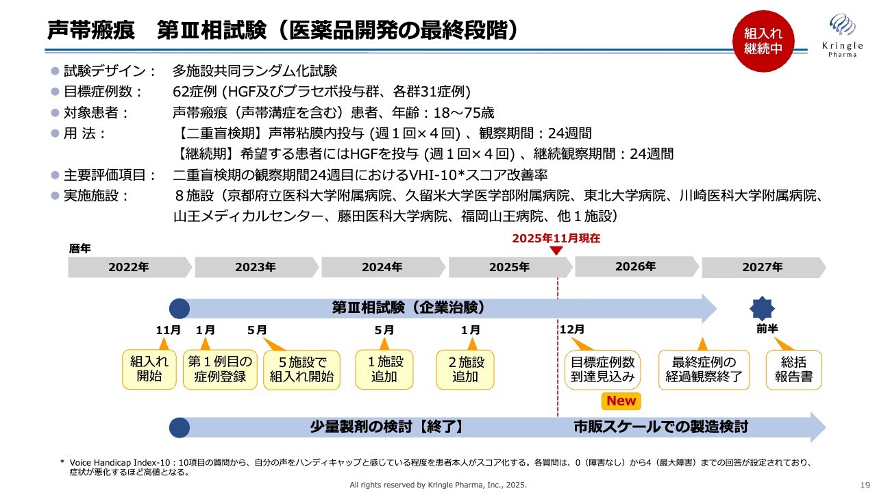 声帯瘢痕については、第Ⅲ相臨床試験を国内で進めており、現在8施設で患者さまの組入れを継続しています。今年の12月までに目標症例数に到達する見込みがほぼ明確になったため、新しい情報としてこちらに掲示しています。