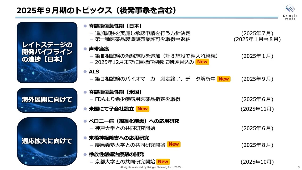 こちらが本日のアジェンダです。はじめに、2025年9月期のトピックスをまとめてお話しします。続いて、各開発パイプラインの進捗状況として、脊髄損傷急性期、声帯瘢痕、筋萎縮性側索硬化症(ALS)についてご説明します。