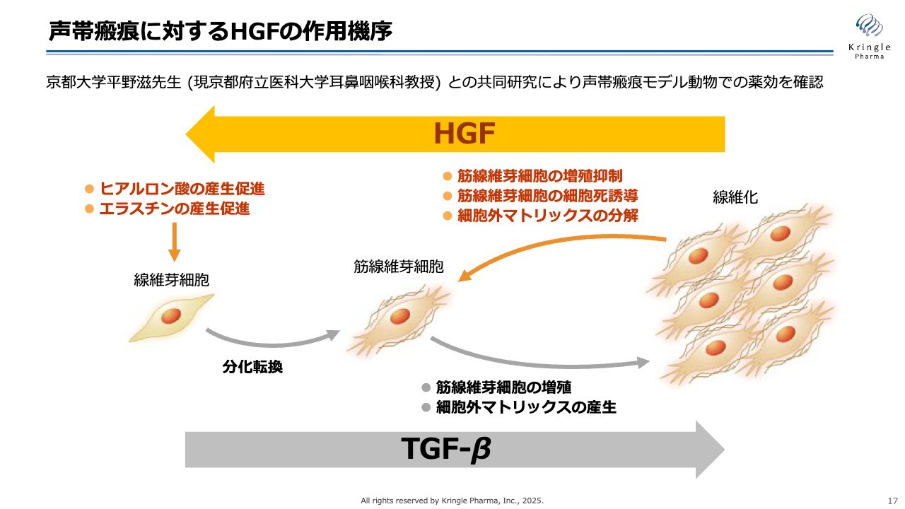 国内におけるHGFの脊髄損傷急性期については、投資家のみなさまの期待に応えることができず、承認申請が後ずれとなりました。しかし、必ず追加試験を実施し、承認申請を行います。それに先立ち、声帯瘢痕の承認申請という大きなマイルストーンも控えています。