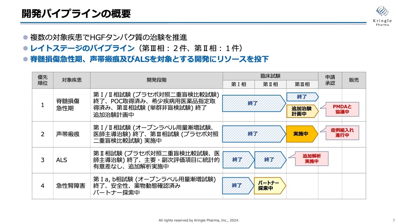 各開発パイプラインの進捗状況についてお話しします。こちらは、臨床段階にあるパイプラインの概要を示しています。内容は前回の決算説明会から変更はありません。脊髄損傷急性期の追加治験については、後ほど詳細をお話しします。