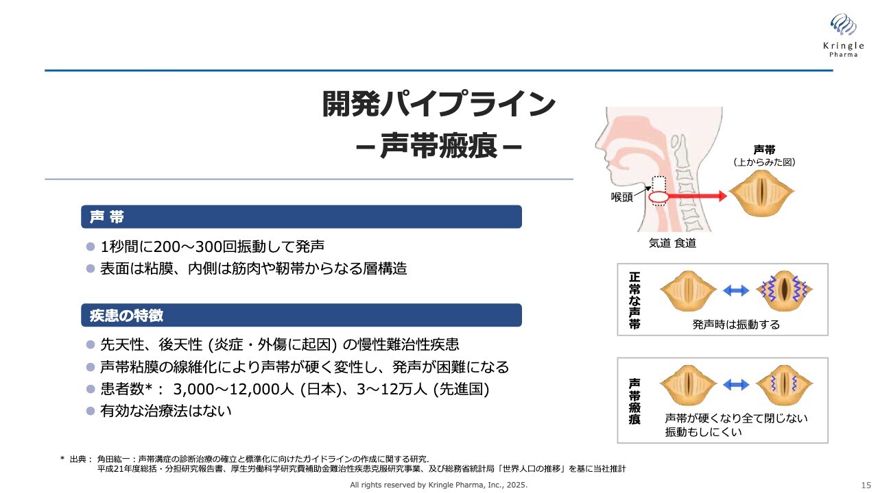 続いて、第2パイプラインである声帯瘢痕についてご説明します。声帯は非常にデリケートな粘膜構造を持つ組織ですが、なんらかの原因で線維化し、正常に振動しなくなると、初期段階では声が出にくくなり、重症化すると声が出なくなる疾患です。