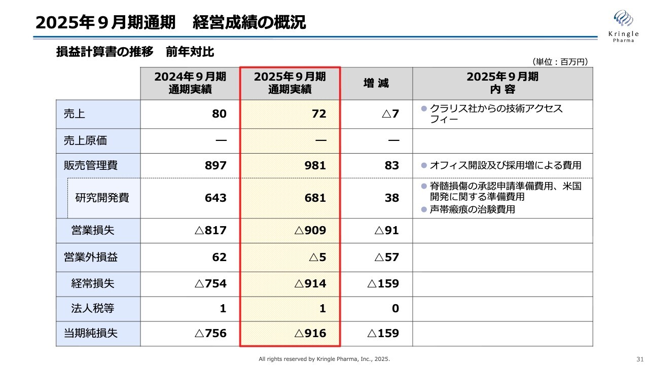 売上はクラリス社からの技術アクセスフィーとして7,200万円です。研究開発費は前年とほぼ同じ6億8,100万円であり、主な内容は脊髄損傷の申請に向けた米国での準備費用や声帯瘢痕の治験費用です。