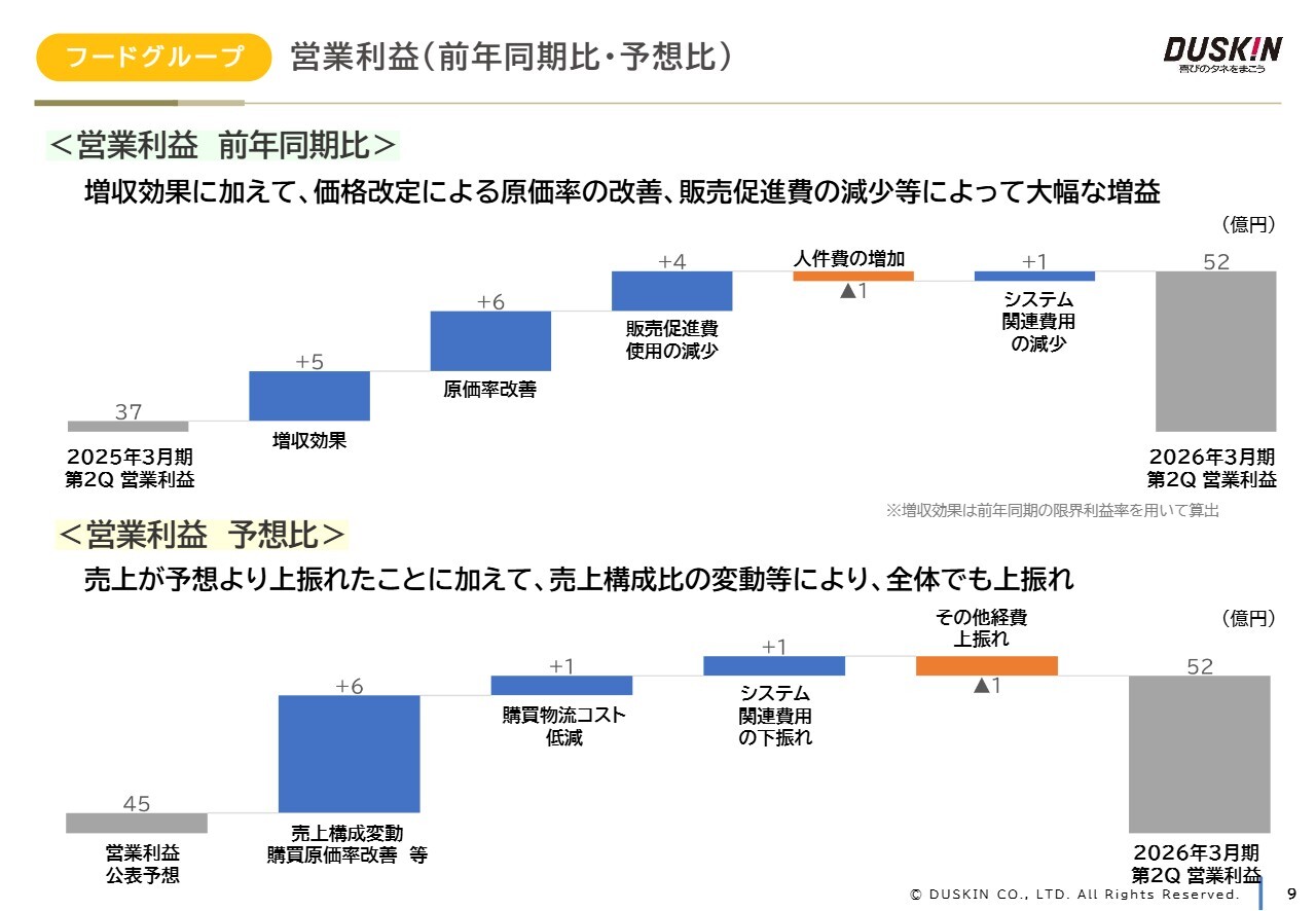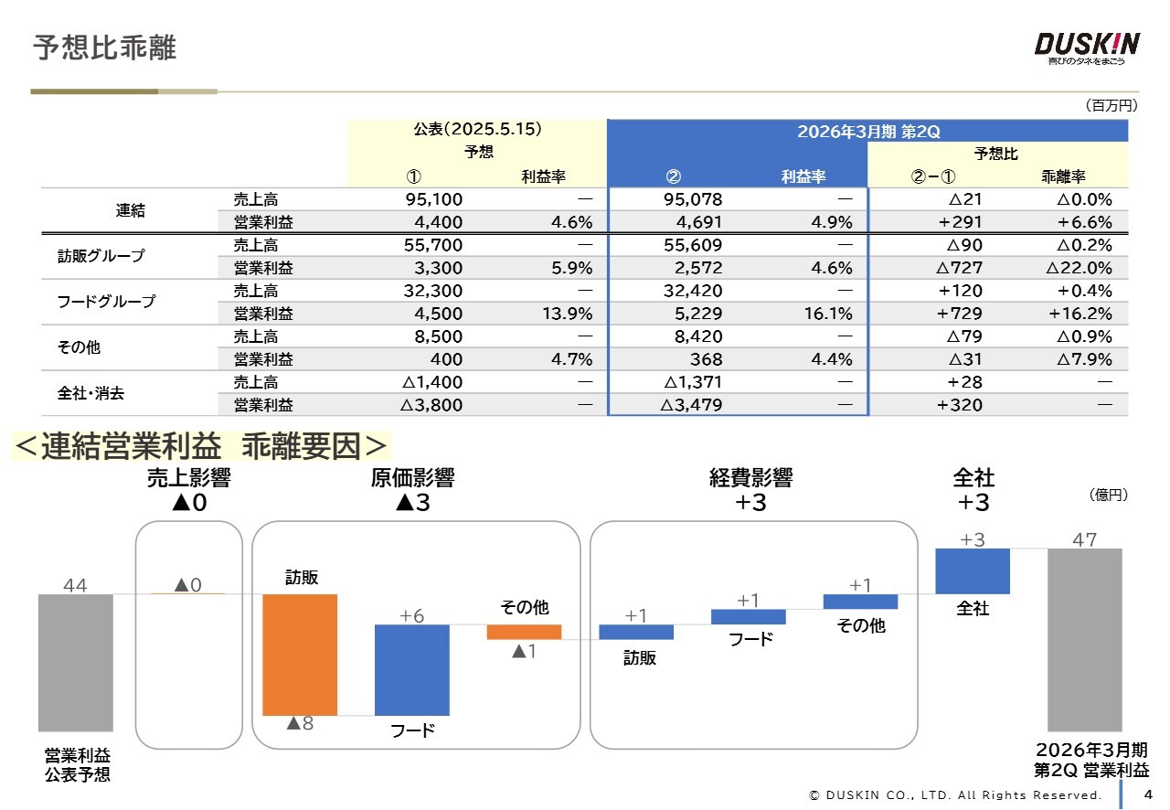 予想比についてです。売上高は各セグメント内での乖離があったものの、全体では概ね予想どおりに推移しました。営業利益については、フードグループの増益効果が大きく、予想を上回る進捗となっています。