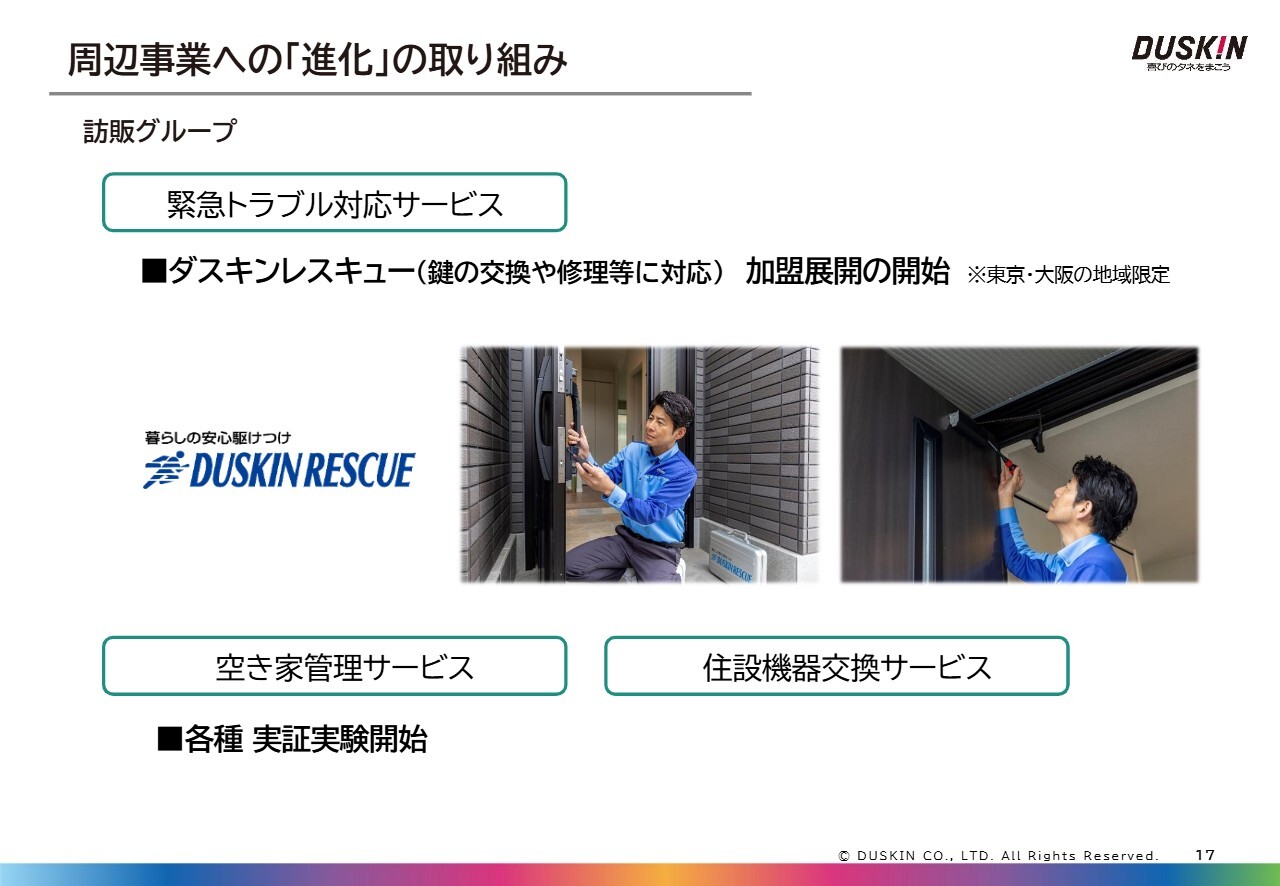 具体的な今期の取り組みとして、鍵の交換や修理に対応する「ダスキンレスキュー」の加盟募集を一部の地域で開始しました。すでに研修も実施、現在はお客さまへのサービス展開の最終段階に入っています。