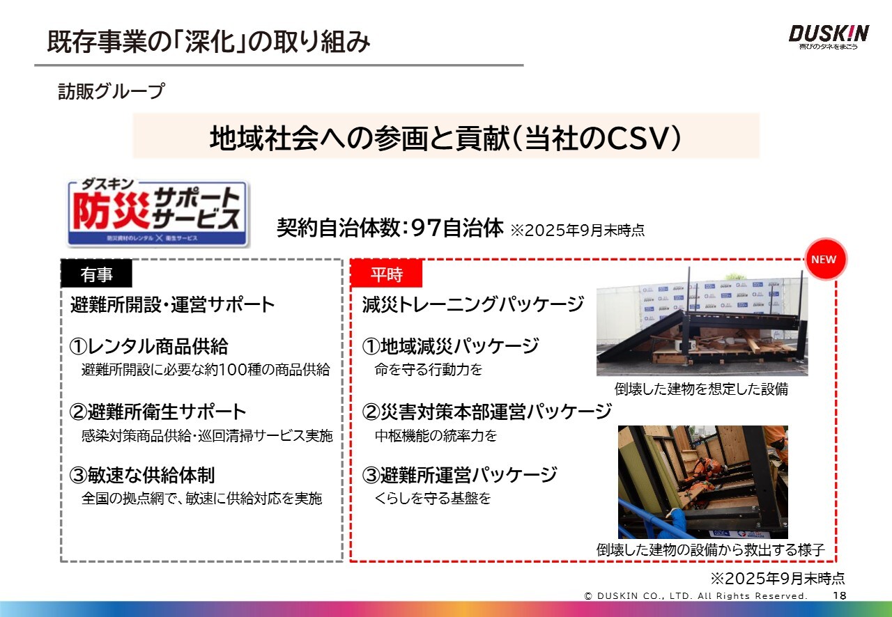 この取り組みは、災害時に少しでも地域の安心・安全を守るための重要な取り組みです。地域に根づいた加盟店ネットワークをこのような活動に活用し、お客さまの暮らしに安心を提供することで、「この街にダスキンがいてよかった」と思っていただける当社ならではのサービスを展開しています。これは、CSVの取り組みの一環とも言えるものです。
