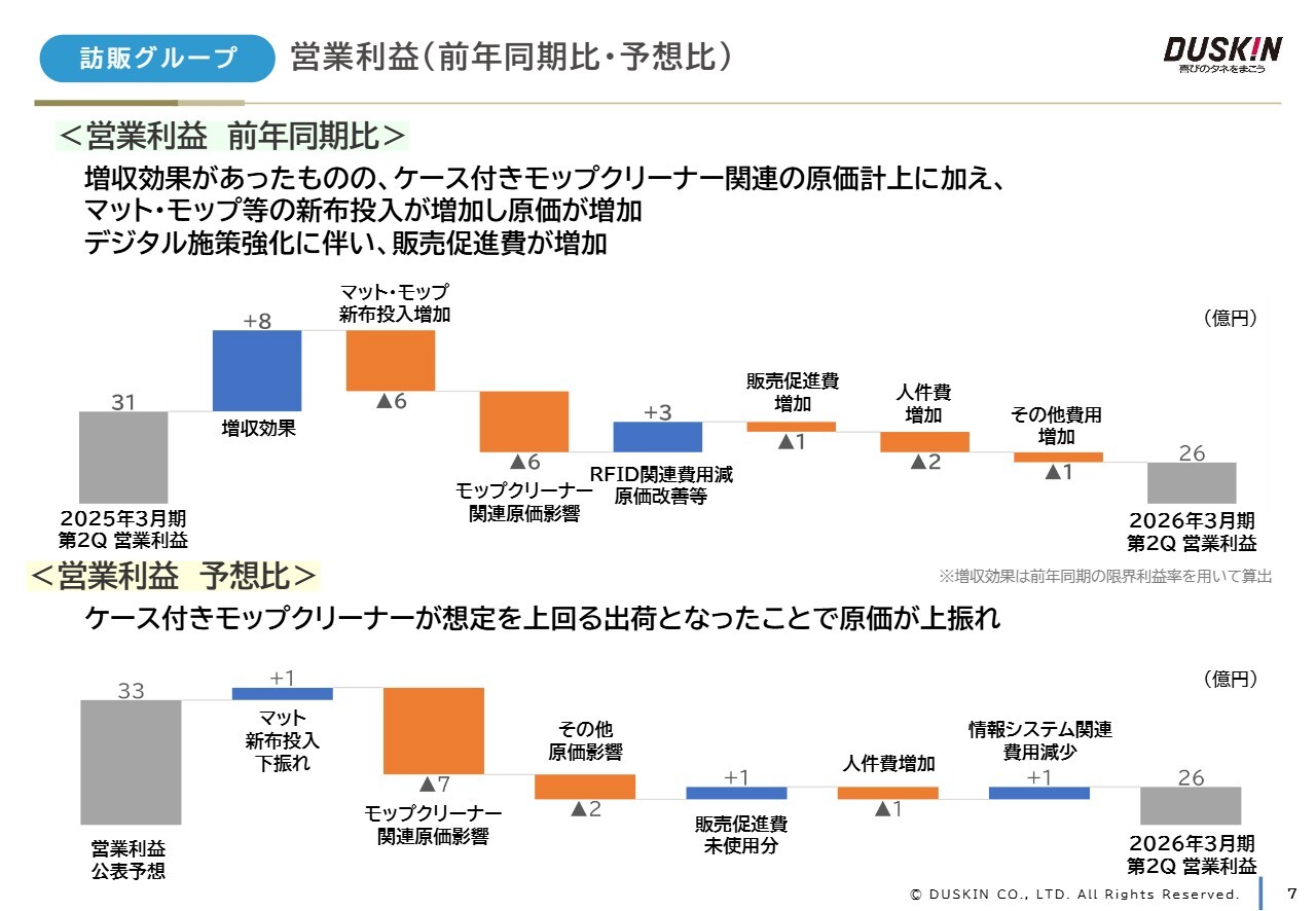 スライドでは、訪販グループの営業利益について、増減要因および乖離要因を示しています。減益および下振れの主な要因は、2025年2月に新発売した「ケース付きモップクリーナー」の原価計上の影響です。