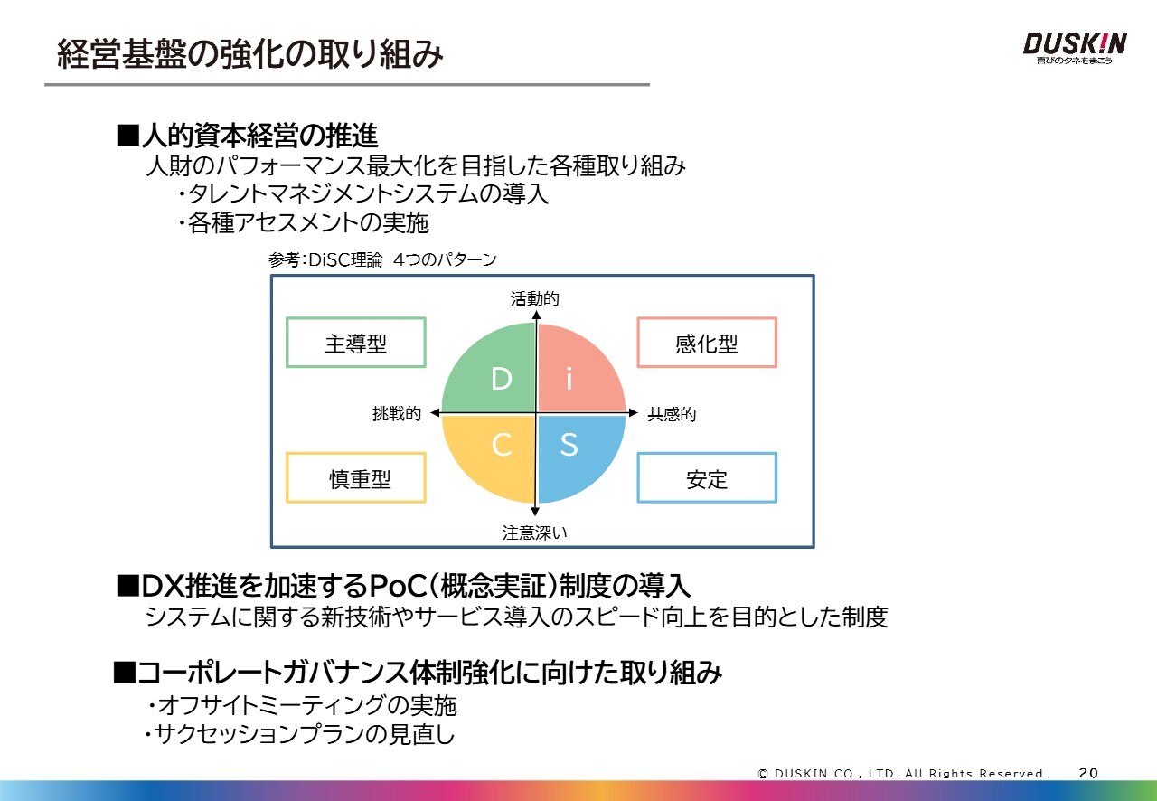 スライド下段に、コーポレートガバナンス体制強化に向けた取り組みと記載しています。こちらは、オフサイトミーティングの実施について示しています。取締役会や経営戦略会議とは別に全役員が集まり、社外役員にもご参加いただき、オフサイトで自由に意見交換を行うミーティングを実施しています。