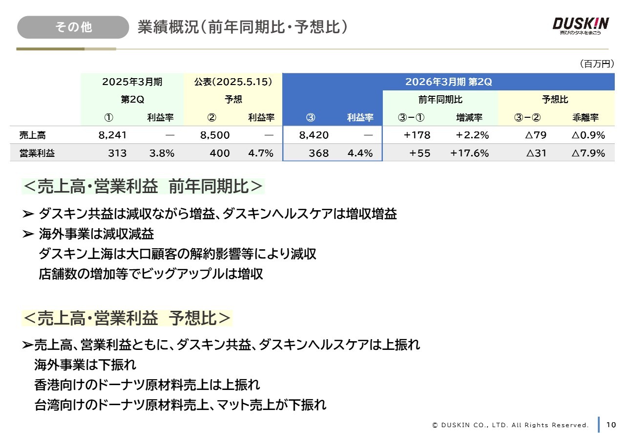 一方、予想に対しては、売上高が0.9パーセント、営業利益が7.9パーセント下振れとなっています。国内連結子会社であるリースおよび保険代理業を行うダスキン共益株式会社は減収増益、病院の衛生管理サービスを展開する株式会社ダスキンヘルスケアは増収増益となりました。