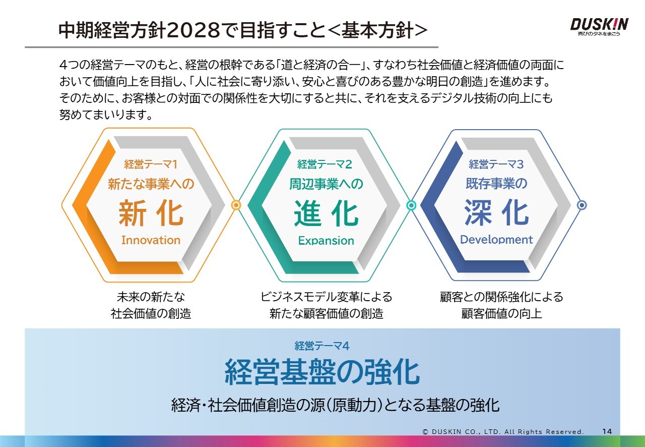 「中期経営方針2028」の第1フェーズでは、スライドに記載のとおり、「新たな事業への新化」「周辺事業への進化」、そして専門性や顧客との関係性強化により顧客価値を向上させる「既存事業の深化」を目指しています。これに加え、経営基盤の強化にも取り組んでいます。
