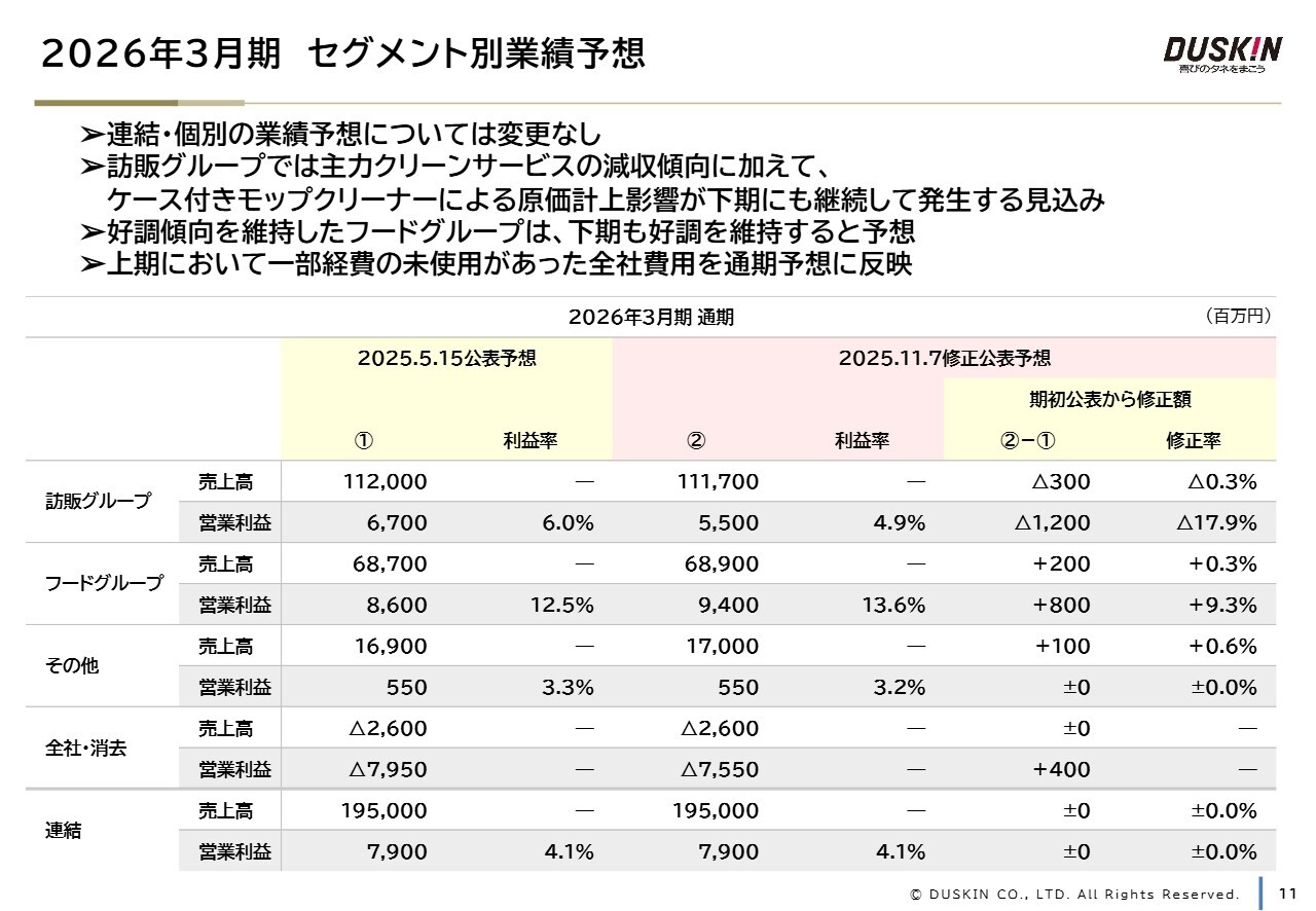2026年3月期の業績予想についてご説明します。通期の業績予想については、2025年5月15日に開示したとおり、連結・個別ともに変更はありません。一方で、セグメントごとの業績予想については、上期の売上動向および原価動向、経費使用状況を勘案し、変更しています。