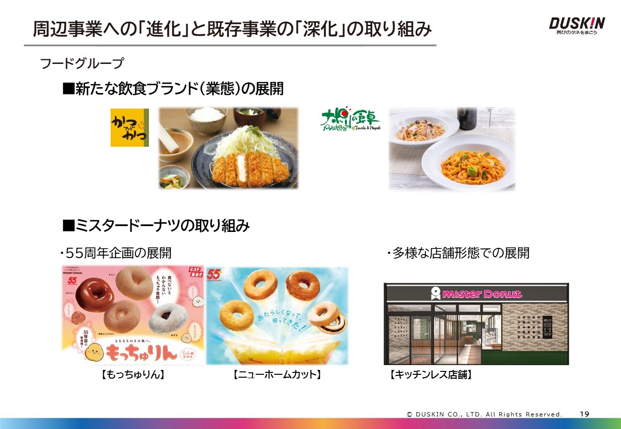 ミスタードーナツ事業についてです。本年度は事業開始から55周年を迎えました。その企画として、スライド左端にある「もっちゅりん」は非常にご好評をいただきましたが、品切れによってお客さまにご迷惑をおかけした部分もありました。