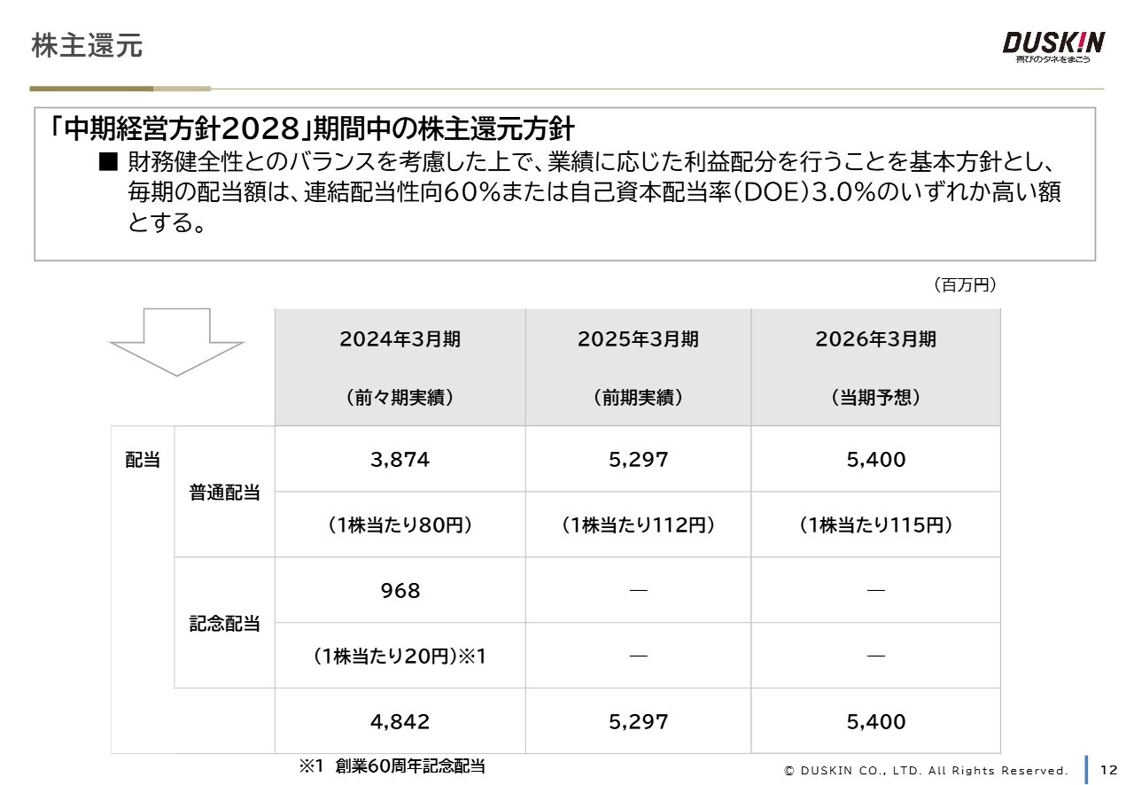 株主還元についてです。当期より株主還元方針の見直しを実施しており、配当方針は「配当性向60パーセントまたは自己資本配当率(DOE)3パーセントのいずれか高い額」としています。