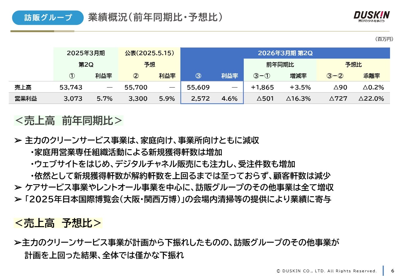 スライド6ページ以降は、セグメントごとの業績を示しています。まず、訪販グループについてご説明します。売上高は前年同期比で18億6,500万円、3.5パーセント増加、556億900万円となりました。一方、予想比では0.2パーセントの下振れとなりました。
