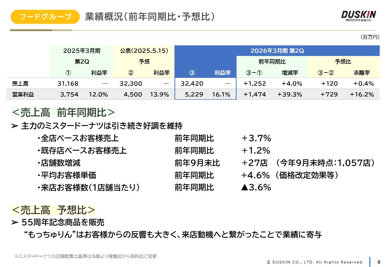 しかし、新規店舗の増加や、昨年7月と今年3月に実施した価格改定により客単価が上昇した結果、全店舗合計のお客さま売上は前年同期を上回りました。また、55周年記念商品である「もっちゅりん」が多くのお客さまにご好評をいただけたことも業績に寄与しました。