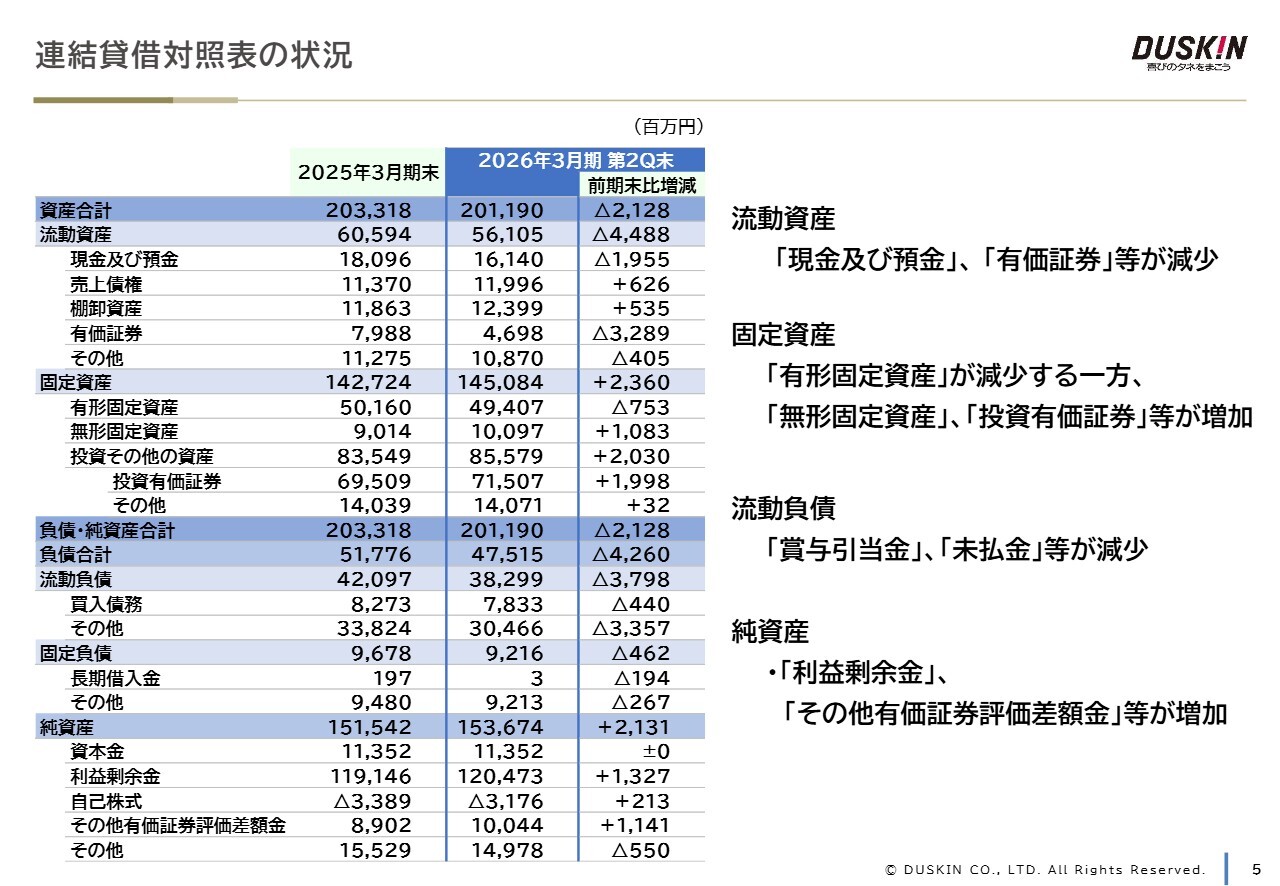 連結貸借対照表です。連結総資産は前期末から21億2,800万円減少、連結純資産は前期末から21億3,100万円増加しました。主な増減項目は、有価証券が32億8,900万円減少、投資有価証券が19億9,800万円増加したことなどです。