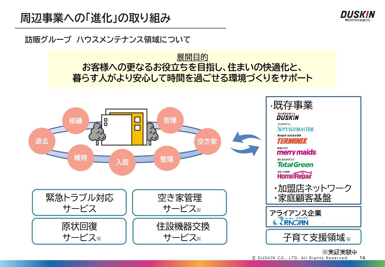 訪販グループの進化についてです。ここでは、周辺事業への幅を広げる進化についてお話しします。訪販グループは、従来から注力してきた衛生領域、ワークライフサポート領域、シニアサポート領域の3つに加えて、新たにハウスメンテナンス領域への拡張にも取り組んでいます。