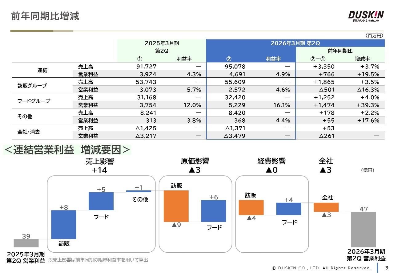 営業利益については、訪販グループが原価率上昇の影響などで減益となったものの、フードグループが大幅な増益を達成したことなどから、全体としては増益となりました。また、持分法による投資利益の増加などにより営業外損益も増加、経常利益および親会社に帰属する中間純利益についても増益となりました。